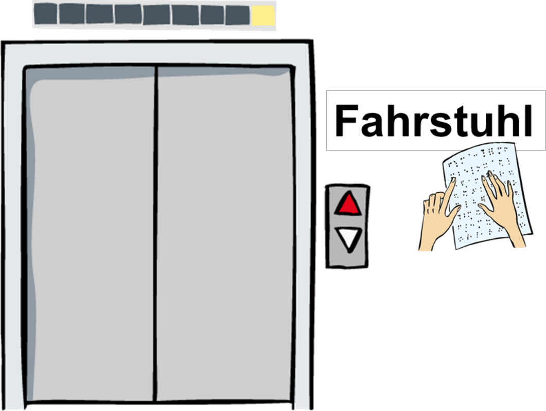 - und vor dem Fahrstuhl und hinter dem Fahrstuhl.