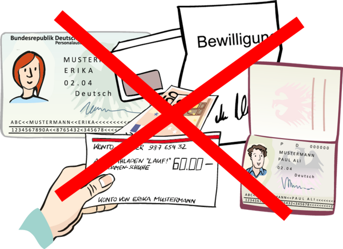 oder der Bescheid vom Job-Center, - die Karte vom Bank-Konto,